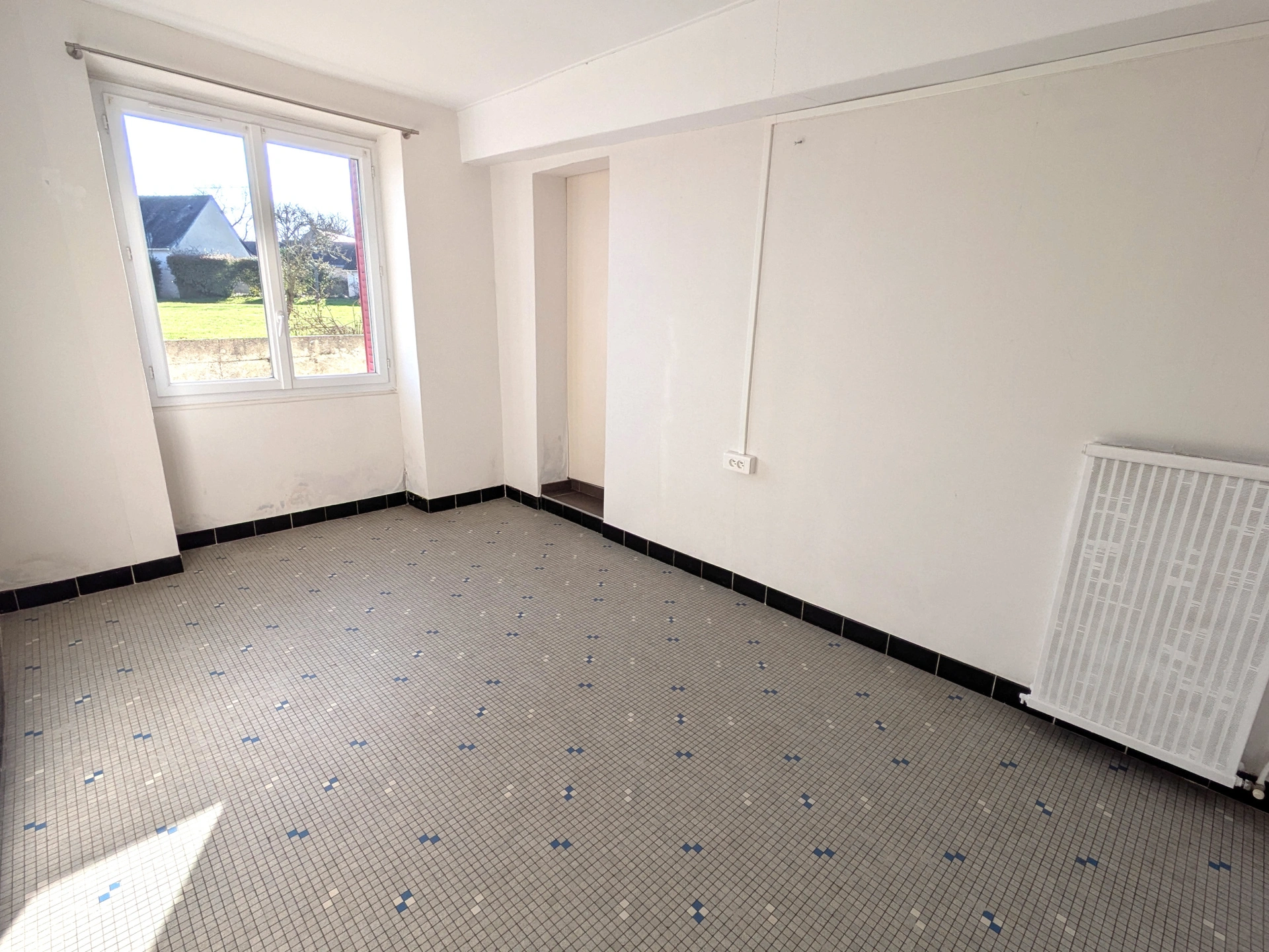 Une entrée, une grande cuisine puis une pièce de vie avec double exposition, donnant sur un beau jardin.
