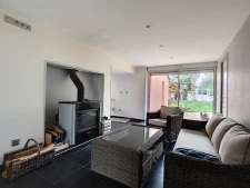 Un Séjour ouvert sur une Grande Cuisine équipée et aménagée , un salon avec un poêle à bois, un bureau, une salle d'eau, un wc.