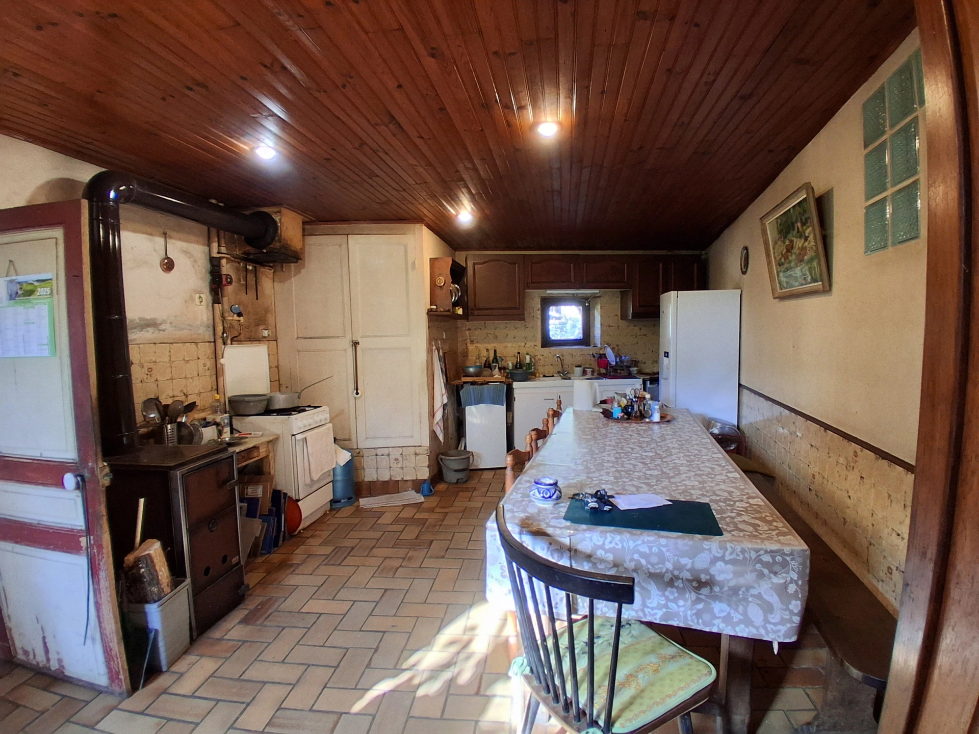 On trouve un Salon-séjour lumineux, une cuisine infépendante, une zone palière, trois chambres, une salle de bain, un grand grenier, une grande grange, un atelier et une cave