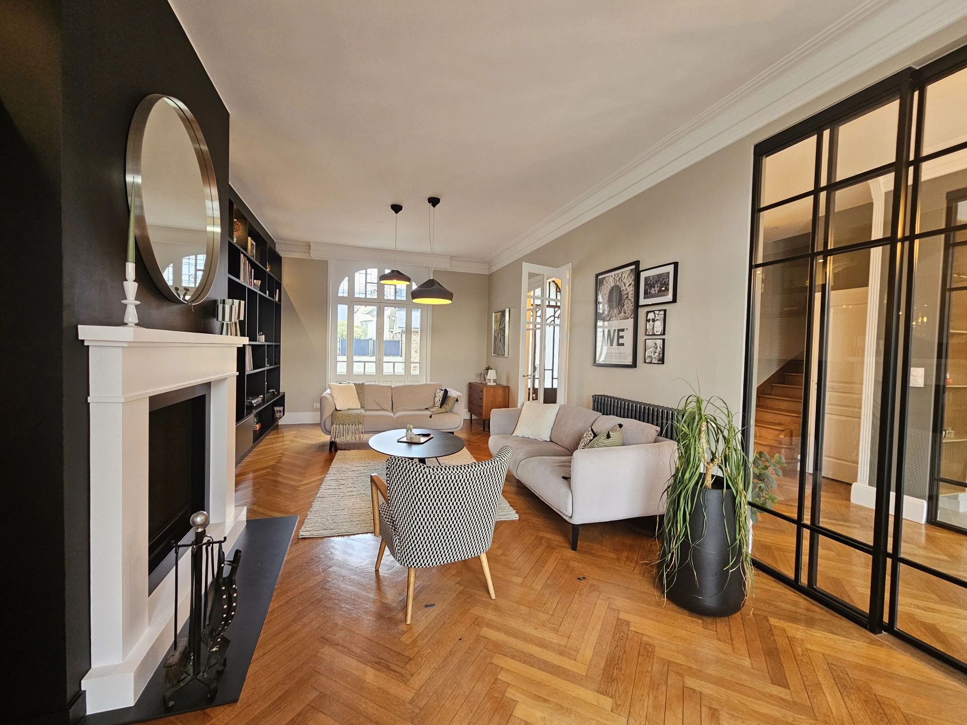 Je vous présente cette très belle maison de caractère au sein d'un quartier stratégiquement bien situé. Ses belles hauteurs sous plafond, ses volumes bien distribués, ses parquets d'origine et sa décoration raffinée vont séduire les amateurs de ce style intemporel. L'entrée en lumière traversante offre de part et d'autre un grand salon avec cheminée insert et une salle de séjour avec cheminée gaz. Dans le prolongement et avec accès au jardin, vous découvrirez une très belle cuisine haut de gamme.