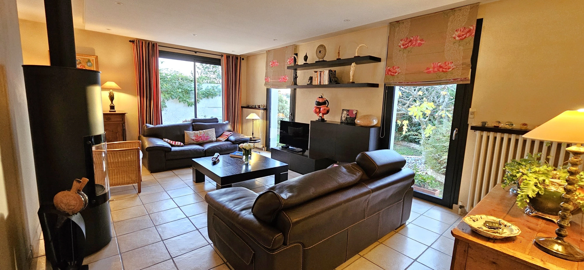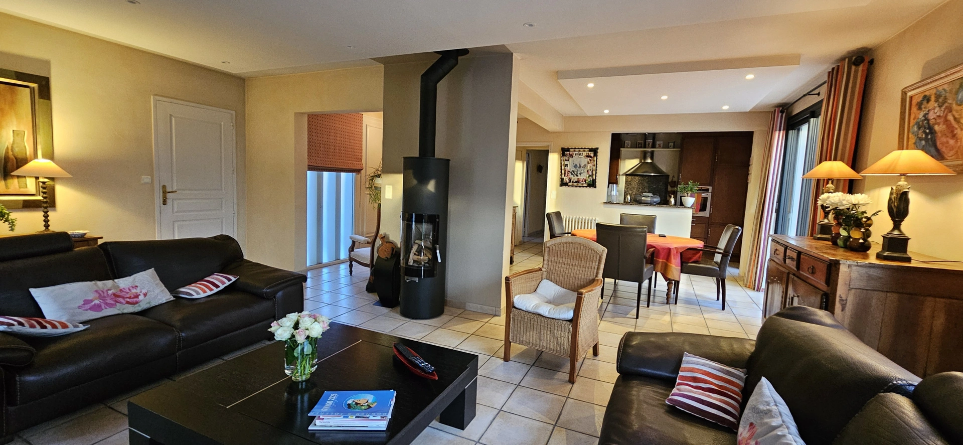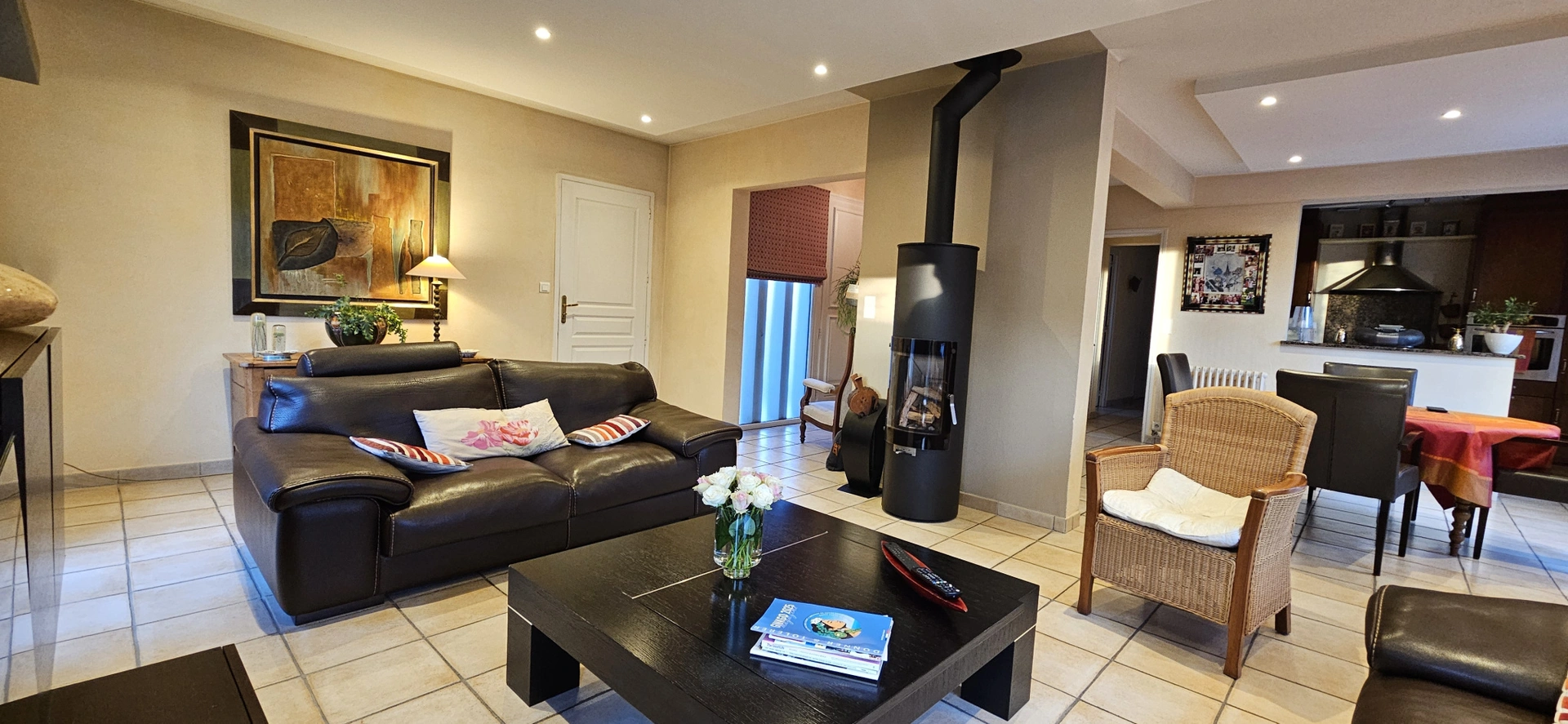 L'entrée s'ouvre sur un salon très lumineux équipé d'un poele à bois et un espace repas contigü à la cuisine aménagée et équipée. Le couloir dessert une buanderie, trois chambres, une salle de bains avec douche à l'italienne et baignoire, un WC. Une cave et un très grand garage de 44m2 viennent en sus.