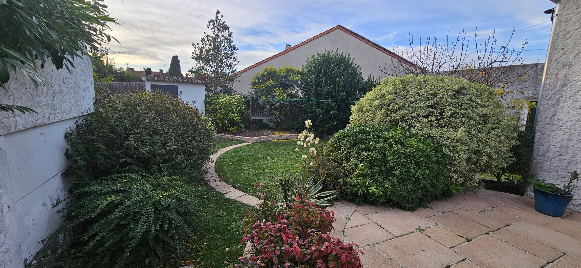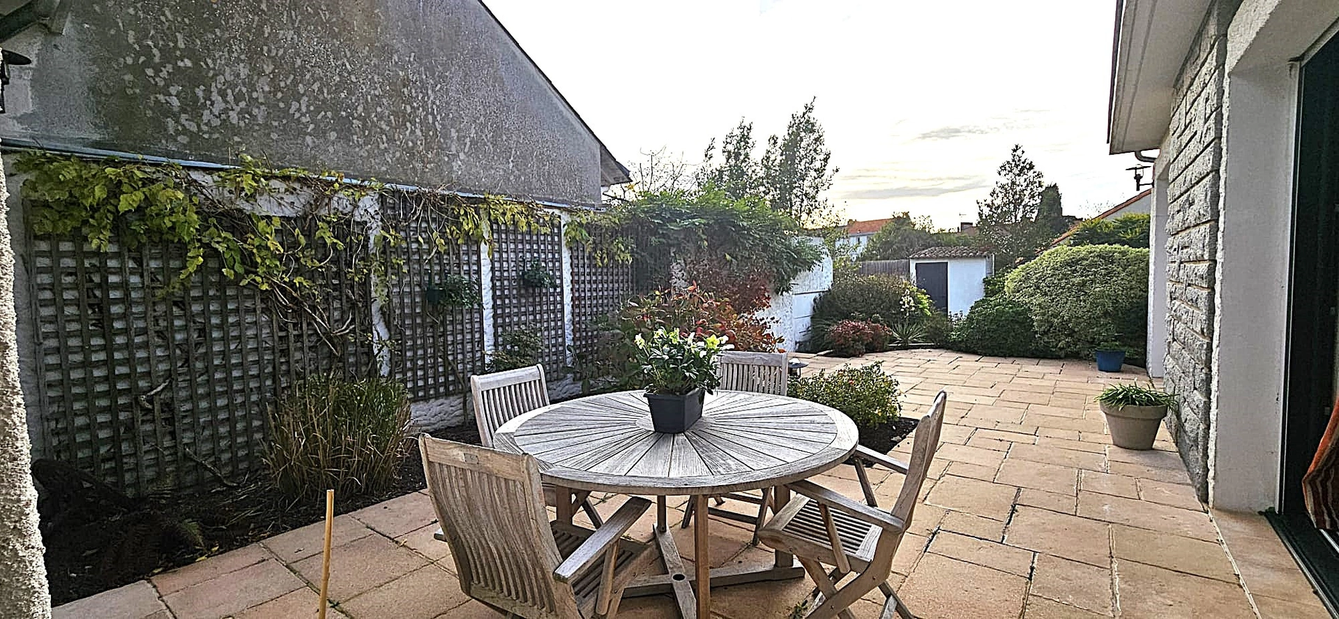 Un joli jardin bénéficie d'une terrasse abritée et d'un espace agrément pelousé.