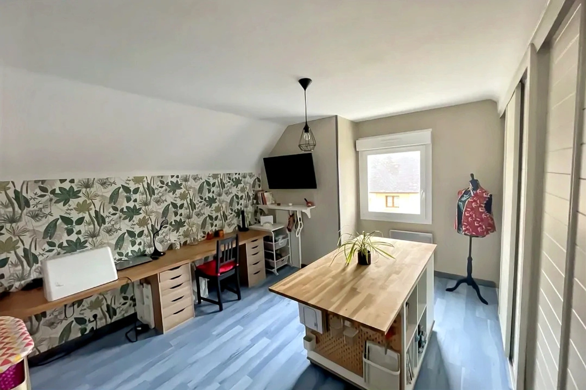 A l'étage, un palier dessert 2 chambres spacieuses avec placard, un bureau ideal pour le télétravail ou comme espace supplémentaire de loisir ainsi qu'une salle de bain avec wc.