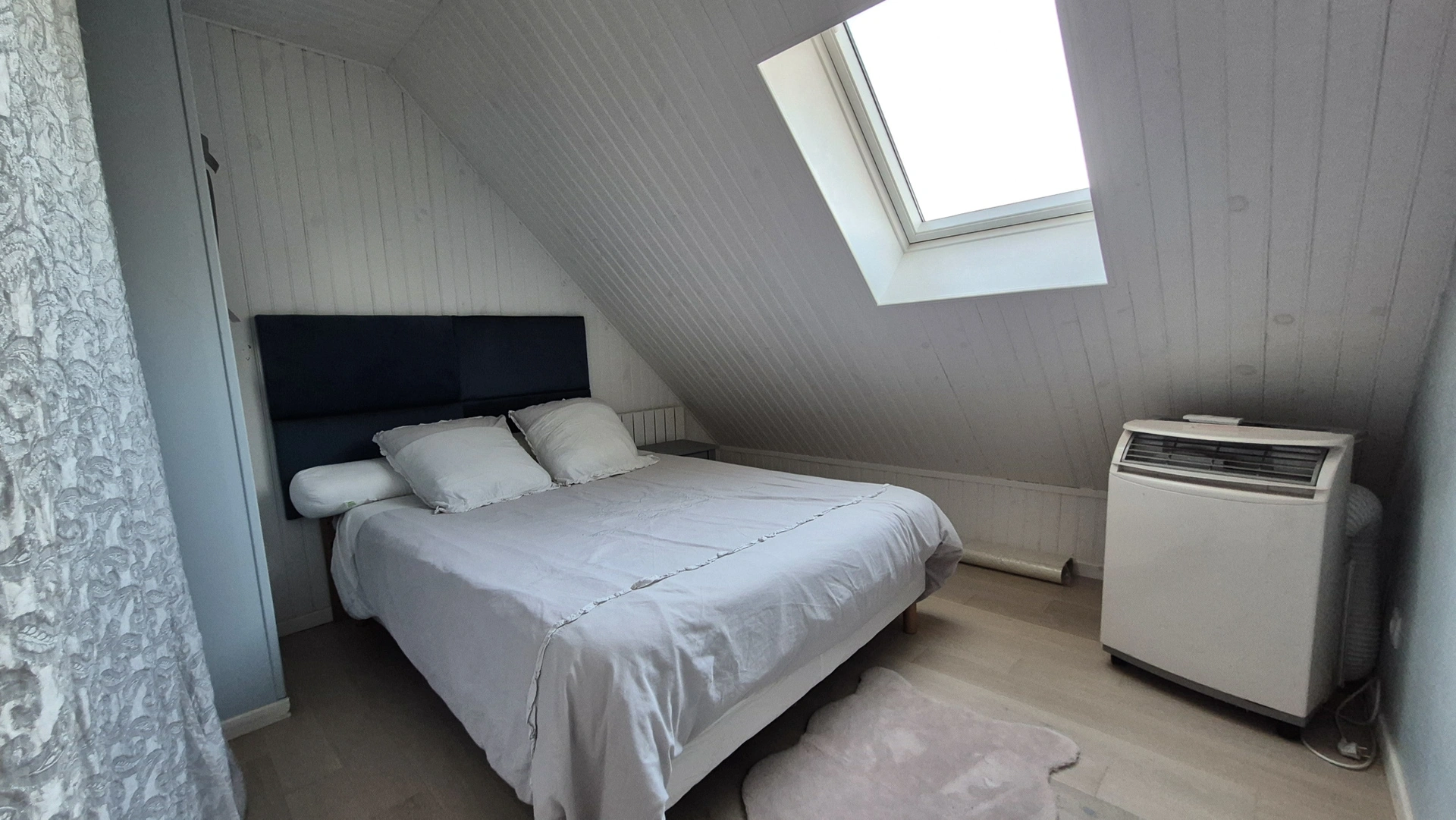 À l'étage, l'espace se compose d'une mezzanine, de deux chambres, d'une salle de bain et d'un grenier servant de rangement pouvant être transformer en dressing.