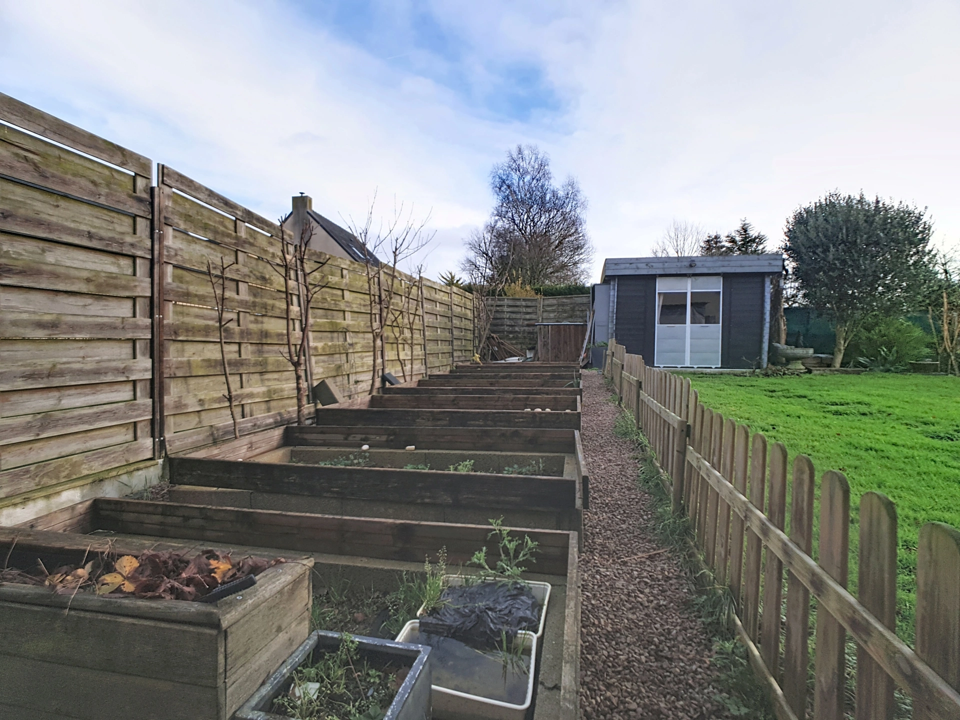 En annexe : un garage, dans le jardin un cabanon, une terrasse avec pergola.