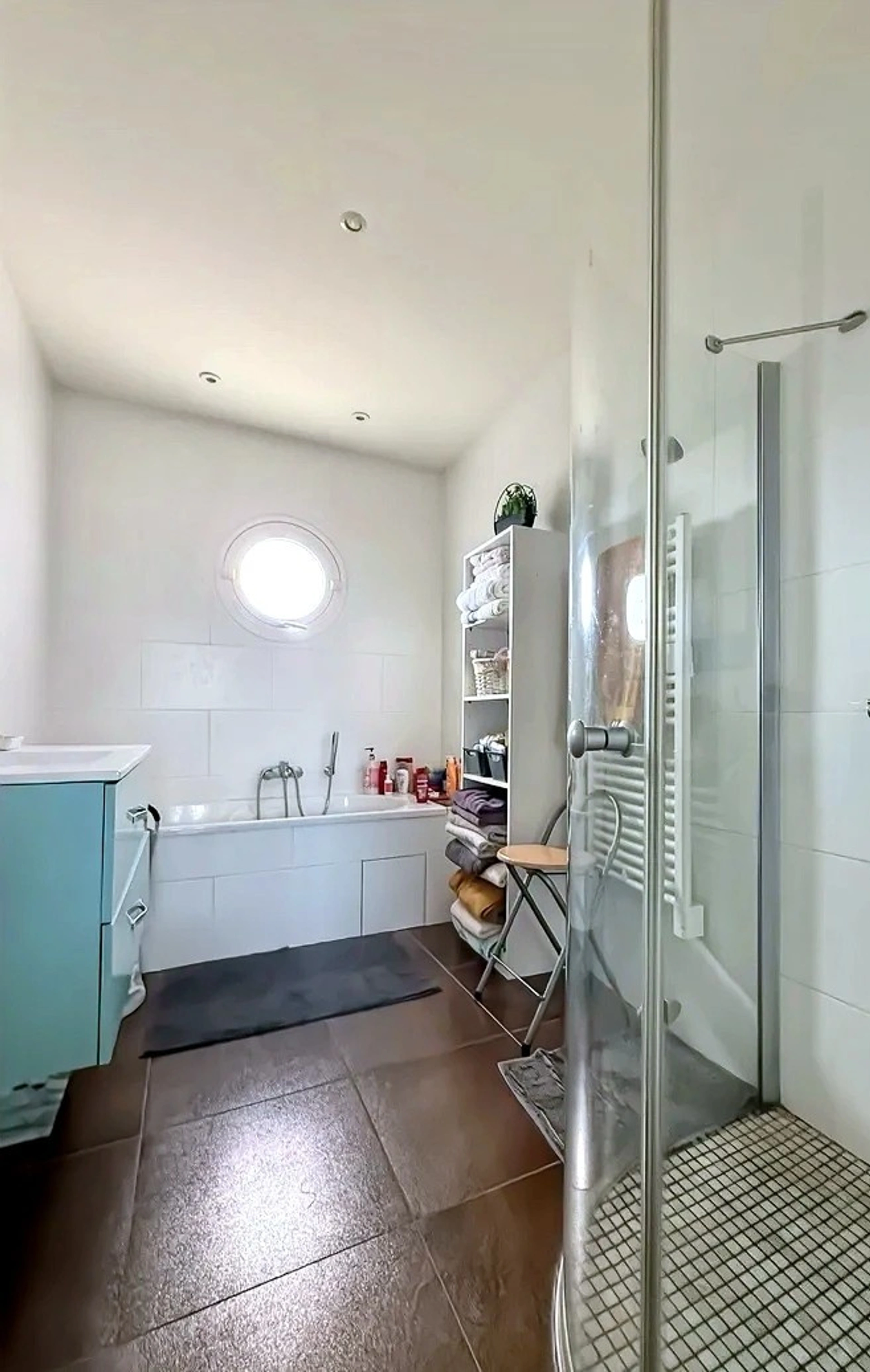 La salle de bain, fonctionnelle et spacieuse, propose à la fois une baignoire et une douche. Un WC indépendant avec fenêtre est situé à l'entrée.