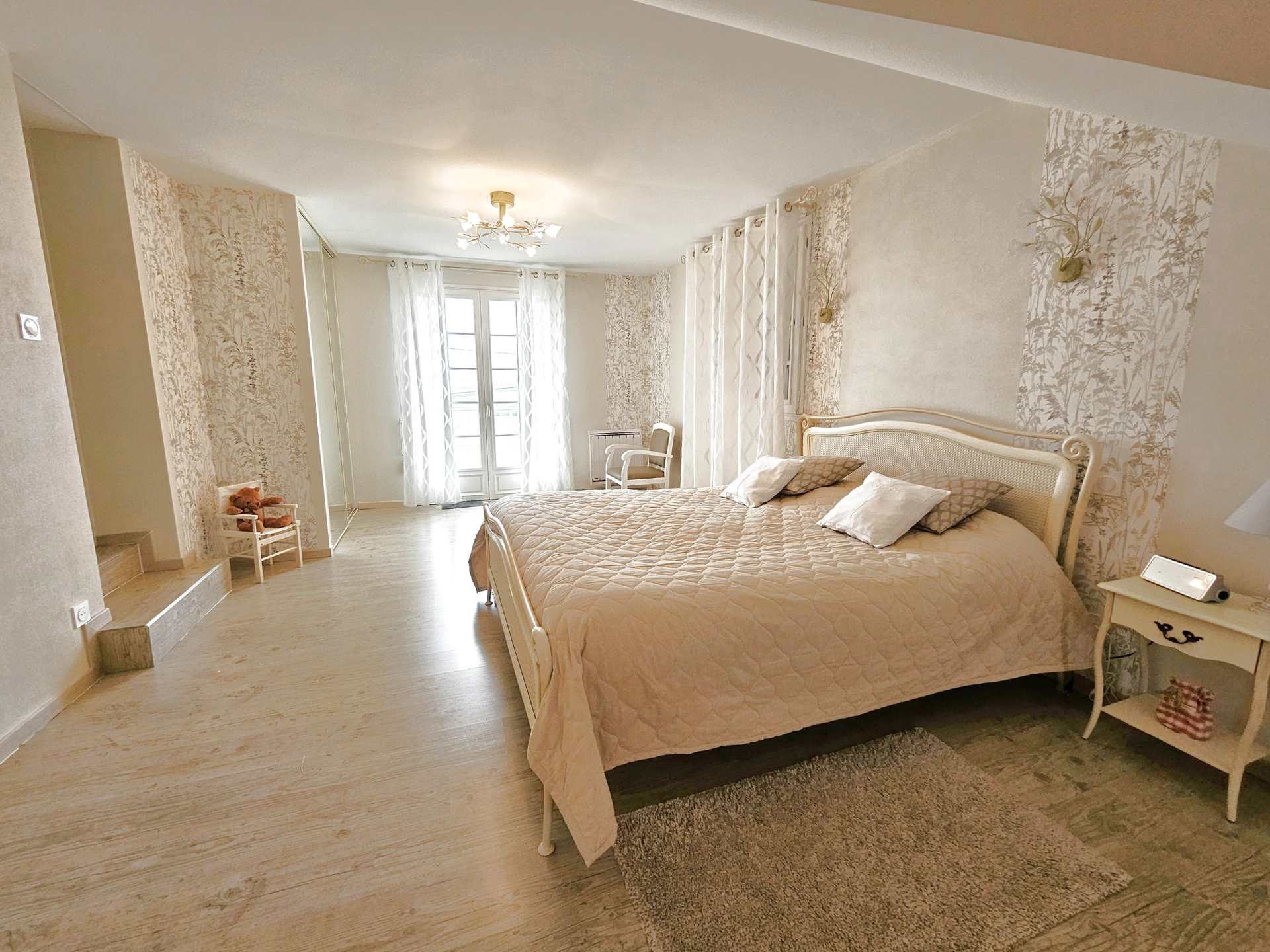 À l'étage, l'espace nuit se poursuit avec deux chambres supplémentaires, dont une avec balcon, offrant une vue dégagée sur l'extérieur.