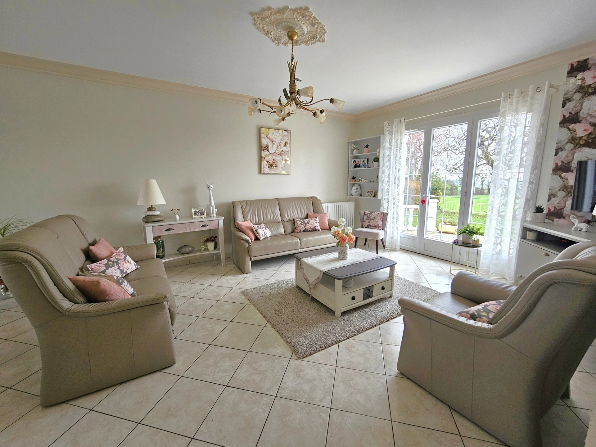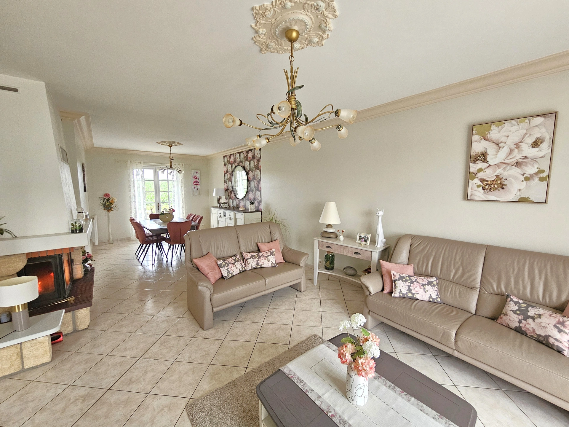 Le salon-séjour, baigné de lumière grâce à sa double exposition nord-sud, séduit par ses volumes et son insert cheminée, créant une atmosphère chaleureuse et conviviale.