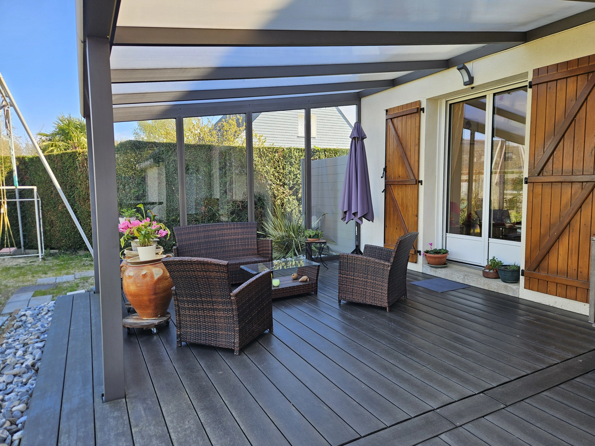 À l'extérieur, tout est pensé pour profiter pleinement : terrain clos, terrasse couverte, garage, espace potager et poulailler...