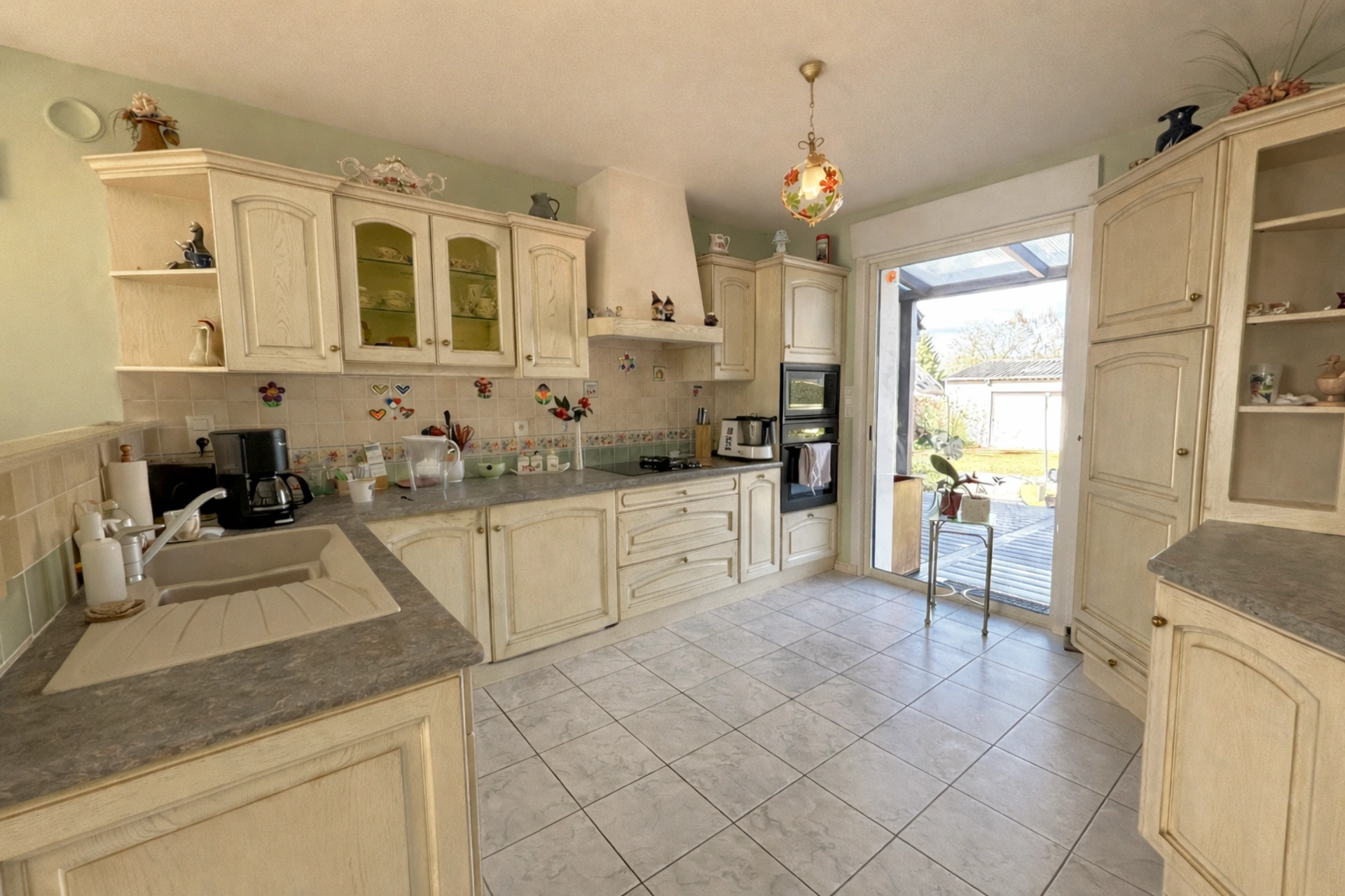 La cuisine ouverte, conviviale, propose un espace repas idéal pour les moments en famille, tandis que le salon-séjour avec insert bois invite à la détente dans une atmosphère chaleureuse.