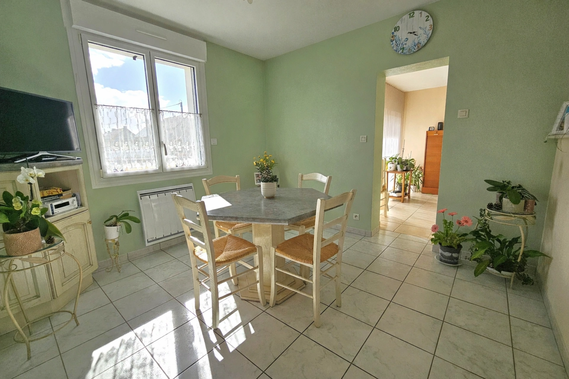 Dès l'entrée, vous découvrez une agréable pièce de vie baignée de lumière grâce à sa double exposition, offrant un ensoleillement optimal tout au long de la journée.