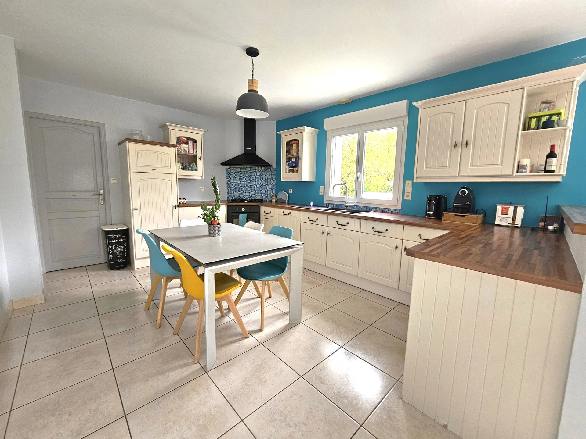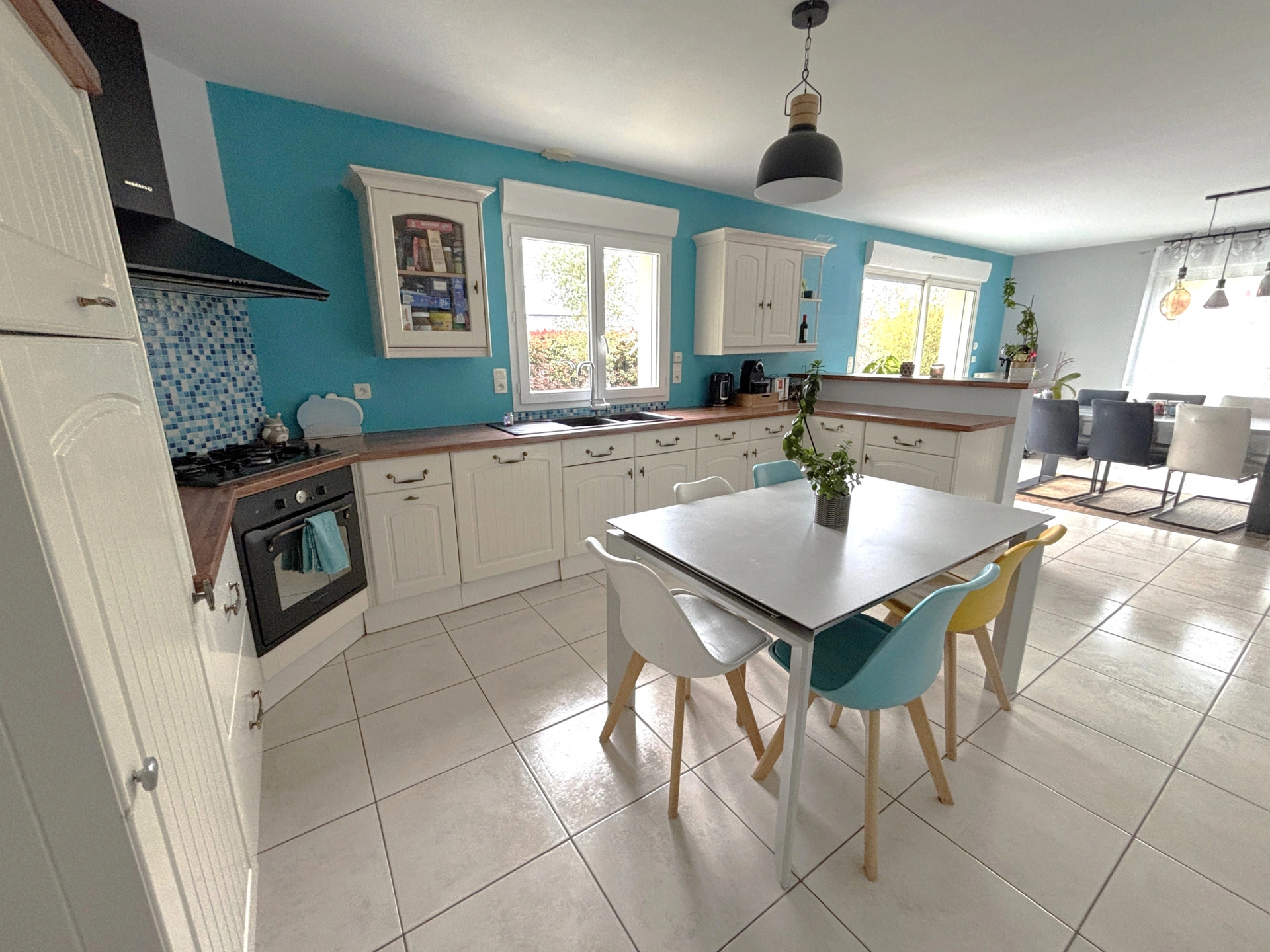 La cuisine ouverte de 17m2, aménagée et équipée, est parfaite avec des plans de travail importants . Au rez-de-chaussée, profitez d'une chambre et sa salle d'eau attenante, WC, ainsi qu'une arrière-cuisine faisant office de buanderie, avec accès direct au garage.