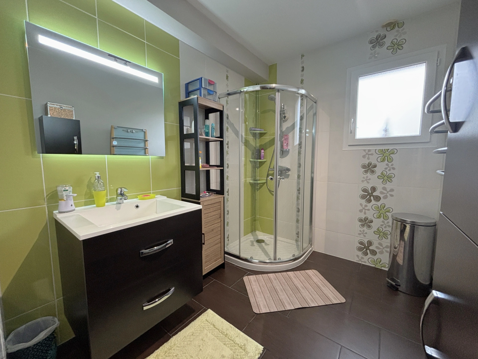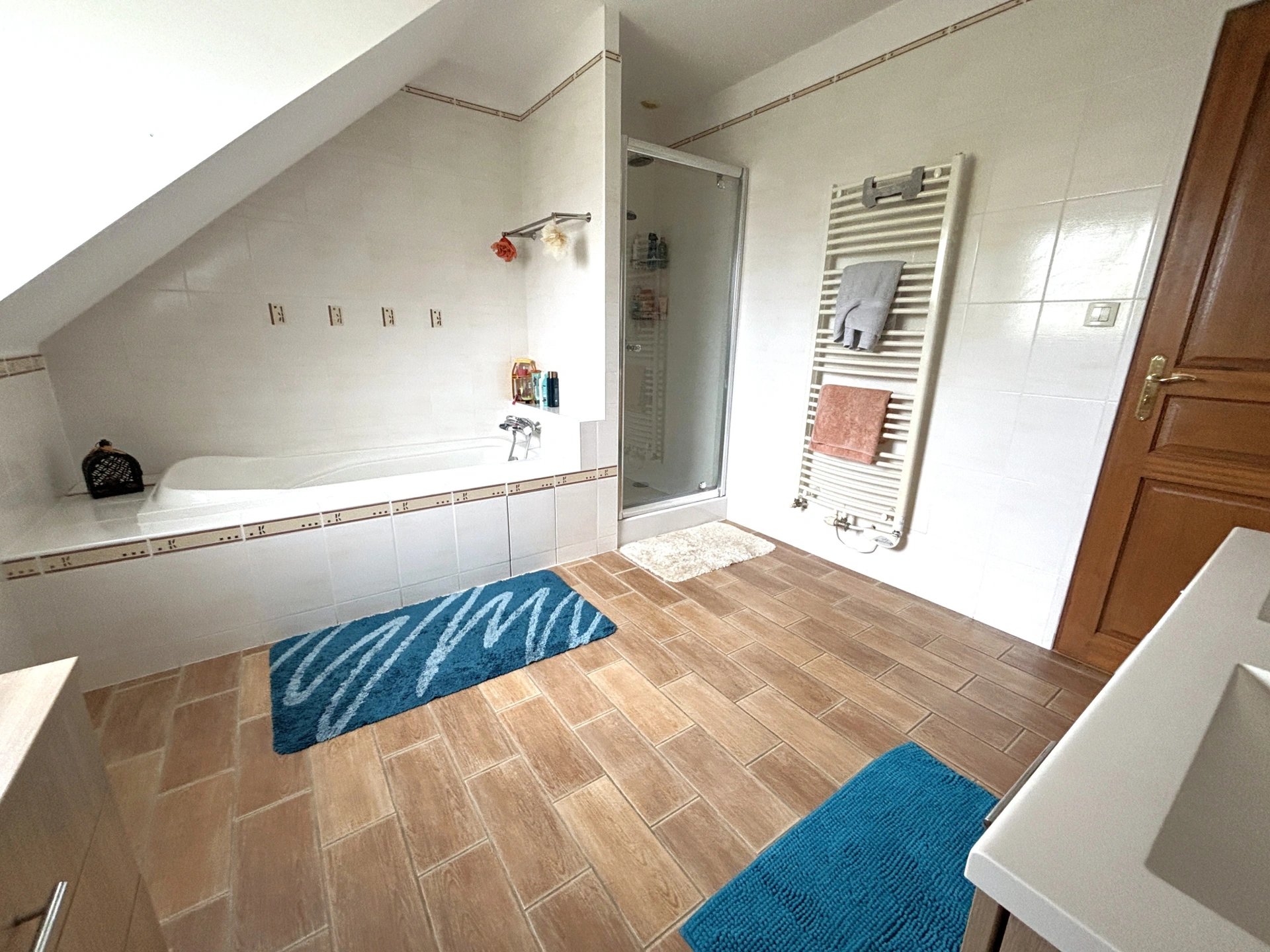 À l'étage, un palier avec espace bureau dessert quatre chambres et une salle de bain avec douche et baignoire, offrant un espace parfait pour toute la famille.
