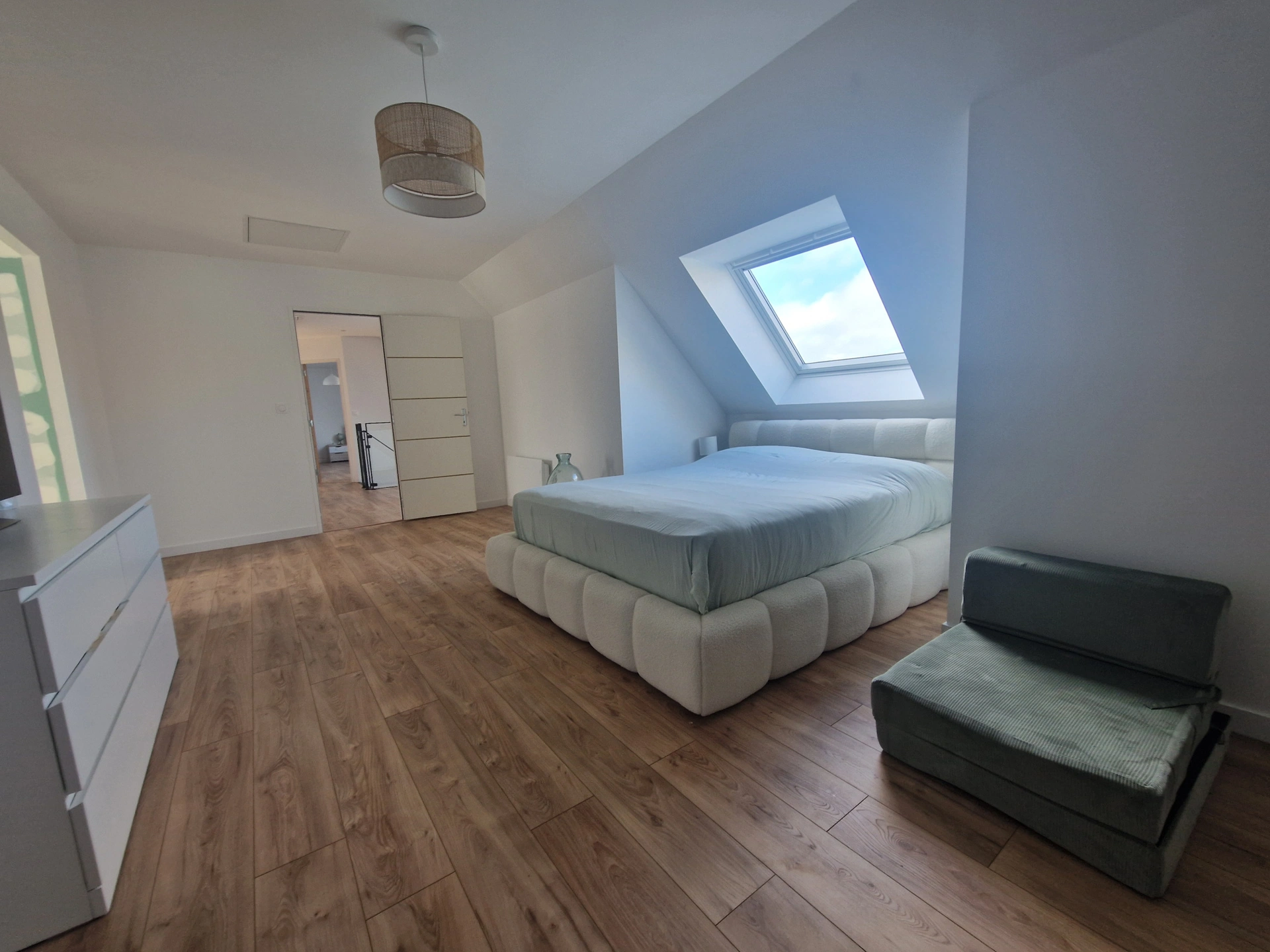 La pièce de vie est dingue, baignée de lumière, fait plus de 65 m2 avec salon, séjour et cuisine ouverte Ixina de 2026, la conception et le blanc/bois sont parfaits. Elle est complètement aménagée et équipée.
