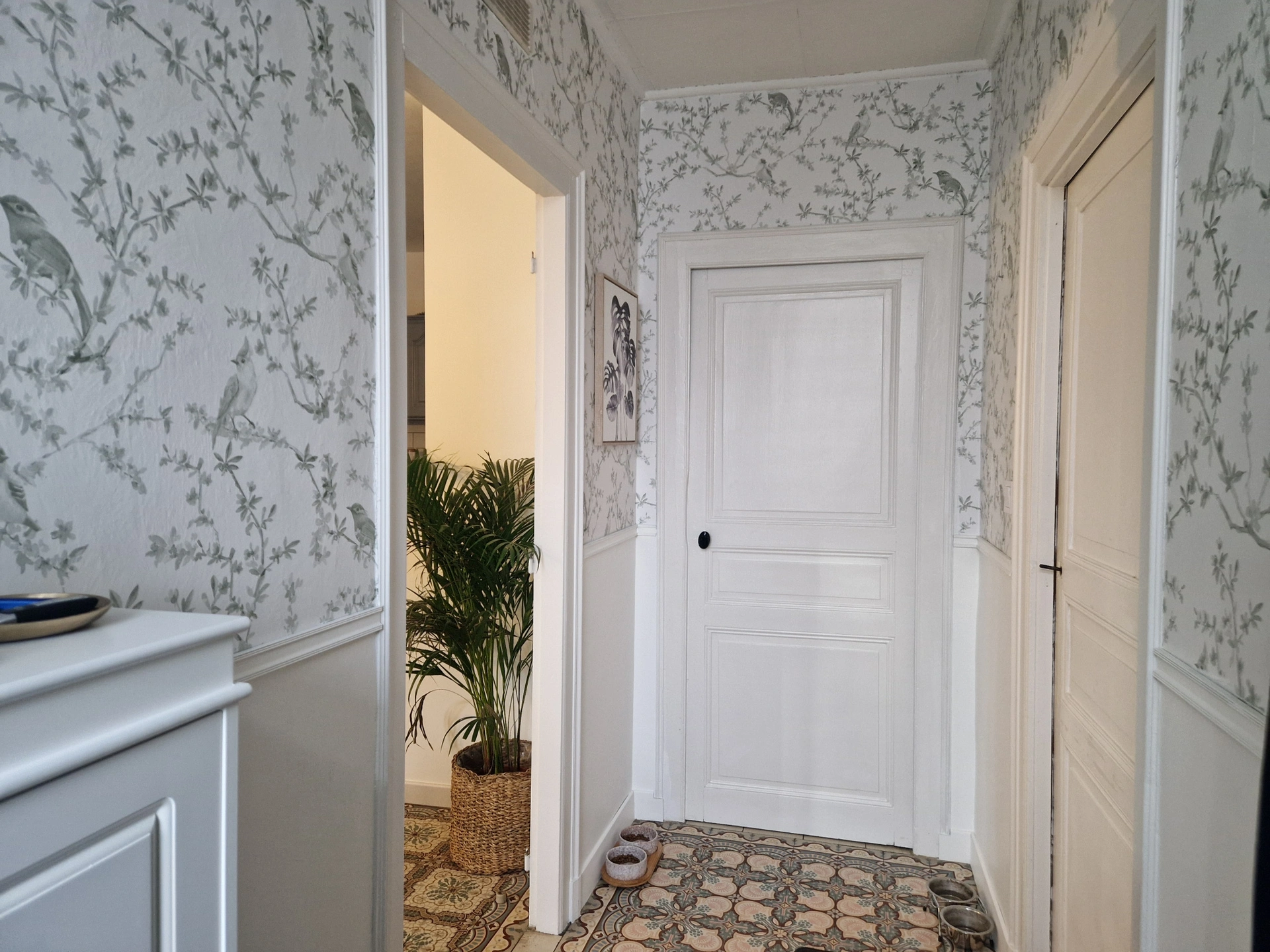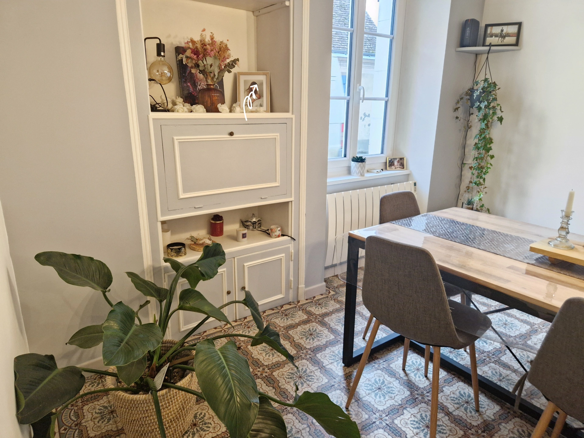 Dès l'entrée, tu seras accueilli(e) par un séjour chaleureux ouvert sur une cuisine aménagée et semi équipée. Les carreaux de ciment d'origine donnent le ton : les amoureux de l'ancien vont craquer.