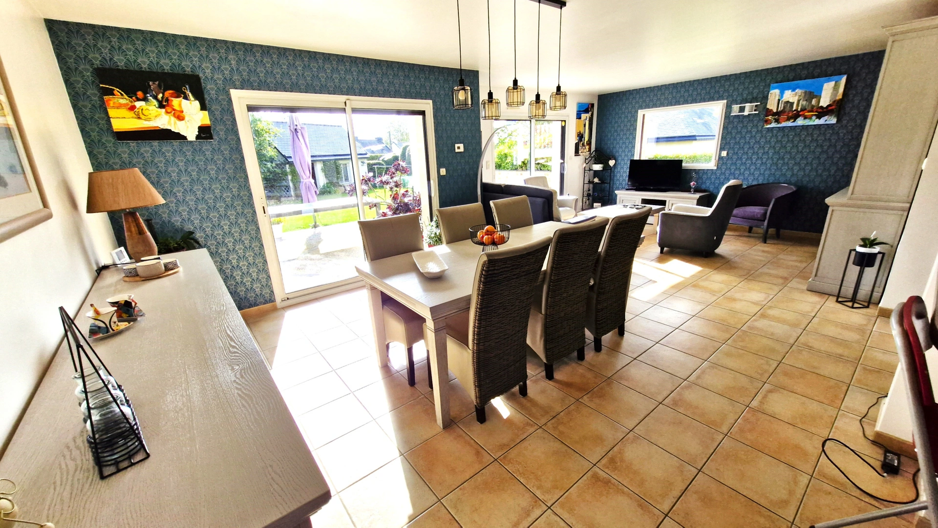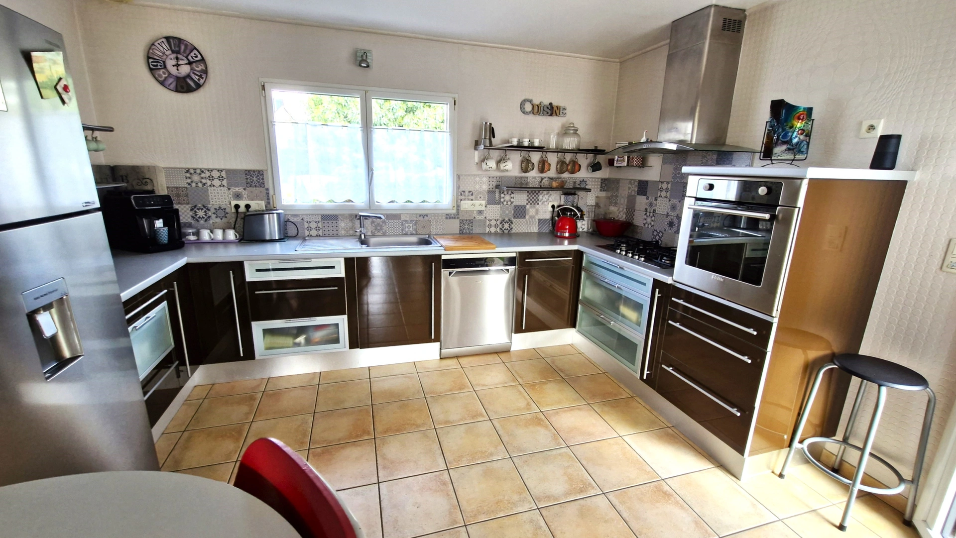 Implantée sur un terrain clos et arboré (portail coulissant éléctrique avec interphone vidéo avec écran), cette maison offre une surface habitable d'environ 114 m2 et se compose d'un vaste séjour-salon-cuisine lumineux d'environ 45 m2, de quatre chambres, une salle de bains, une salle d'eau, d'un grand garage isolé en sous sol.