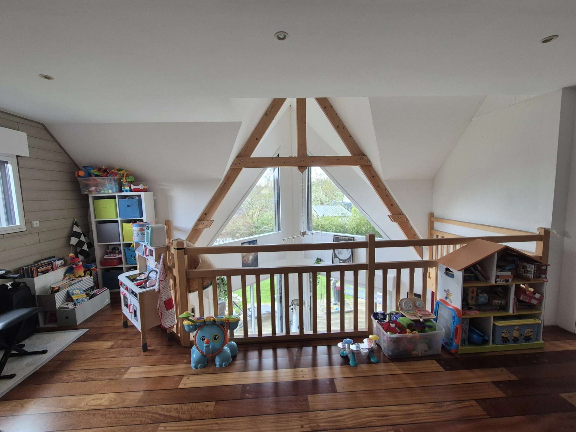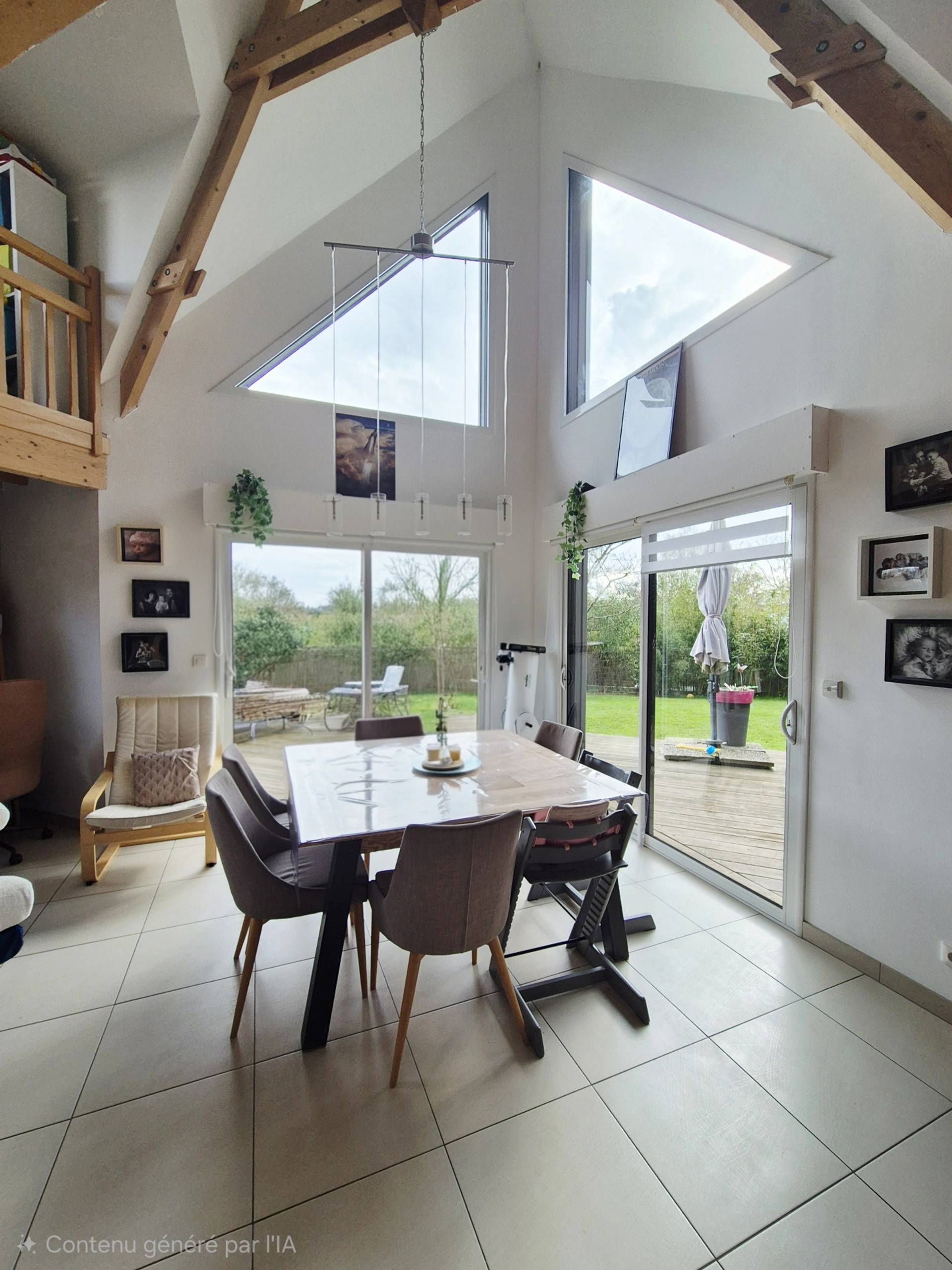 Exclusivité à MEZIERES SUR COUESNON: Beaucoup de cachet pour cette maison en ossature bois d'environ 123m2 comprenant une entrée, salon séjour cathédrale avec placard, cuisine aménagée et équipée ouverte sur le salon, dégagement, toilettes, chambre avec placard et salle d'eau. A l'étage: grande mezzanine, 3 chambres avec placard, salle de bains, toilettes. Grenier avec escalier escamotable. Buanderie, grand garage.