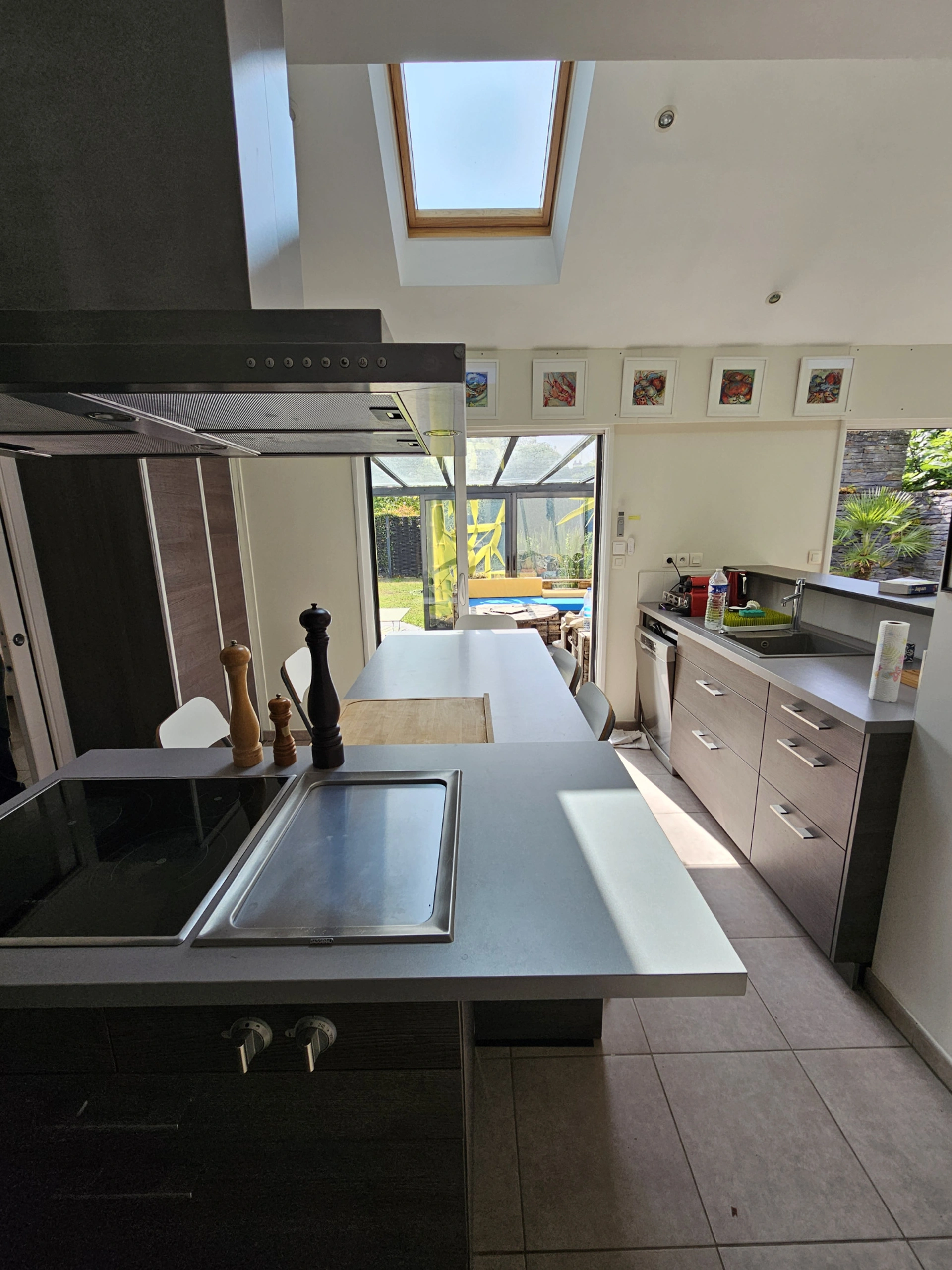 Au rez-de-chaussée, une entrée dessert une vaste pièce de vie très lumineuse d'environ 50m2. Cette réception comprend trois parties, une cuisine américaine équipée avec de l'électroménager haut de gamme donnant sur une verrière, un salon séjour ouvert sur une terrasse grâce à de grandes baies vitrées afin de profiter d'agréables moments en famille ou entre amis et une salle télé pouvant être isolée du reste de la pièce.
