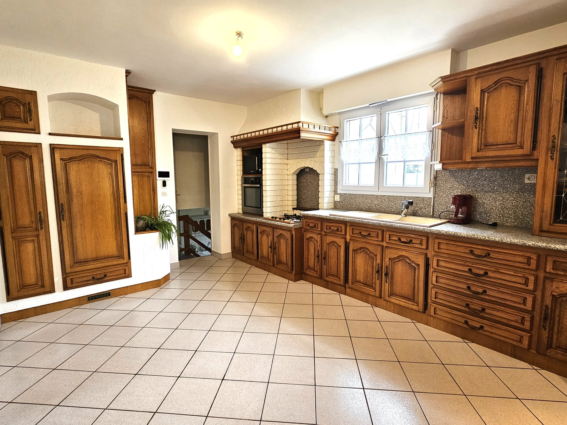 Une entrée puis une pièce de vie chaleureuse avec sa belle cheminée, puis une grande cuisine équipée et aménagée.